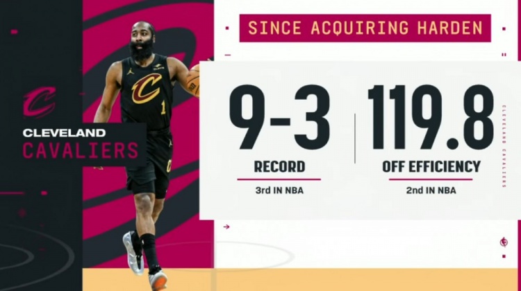 Kaiyun Sports-开云体育-哈登加盟以来骑士战绩9-3期间联盟第三 进攻效率119.8联盟第二!