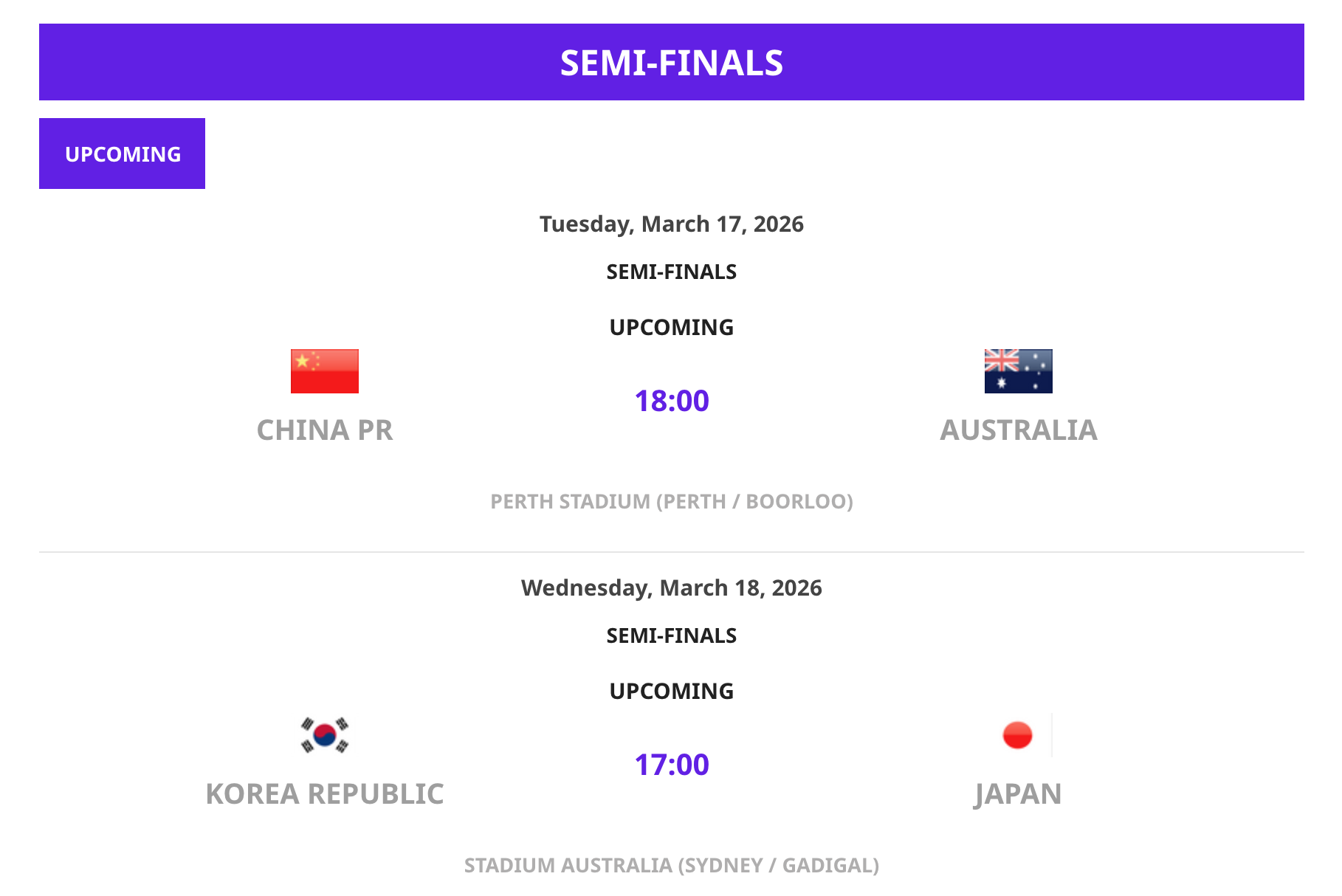 据央视体育消息,北京时间3月15日, 2026亚足联女足亚洲杯两场半决赛对阵出炉,此前2-0战胜中国台北女足的中国女足,将于北京时间3月17日18点对阵东道主澳大利亚。另一场半决赛由韩国女足对阵日本女足。两场比赛的胜者将在3月21日会师决赛。